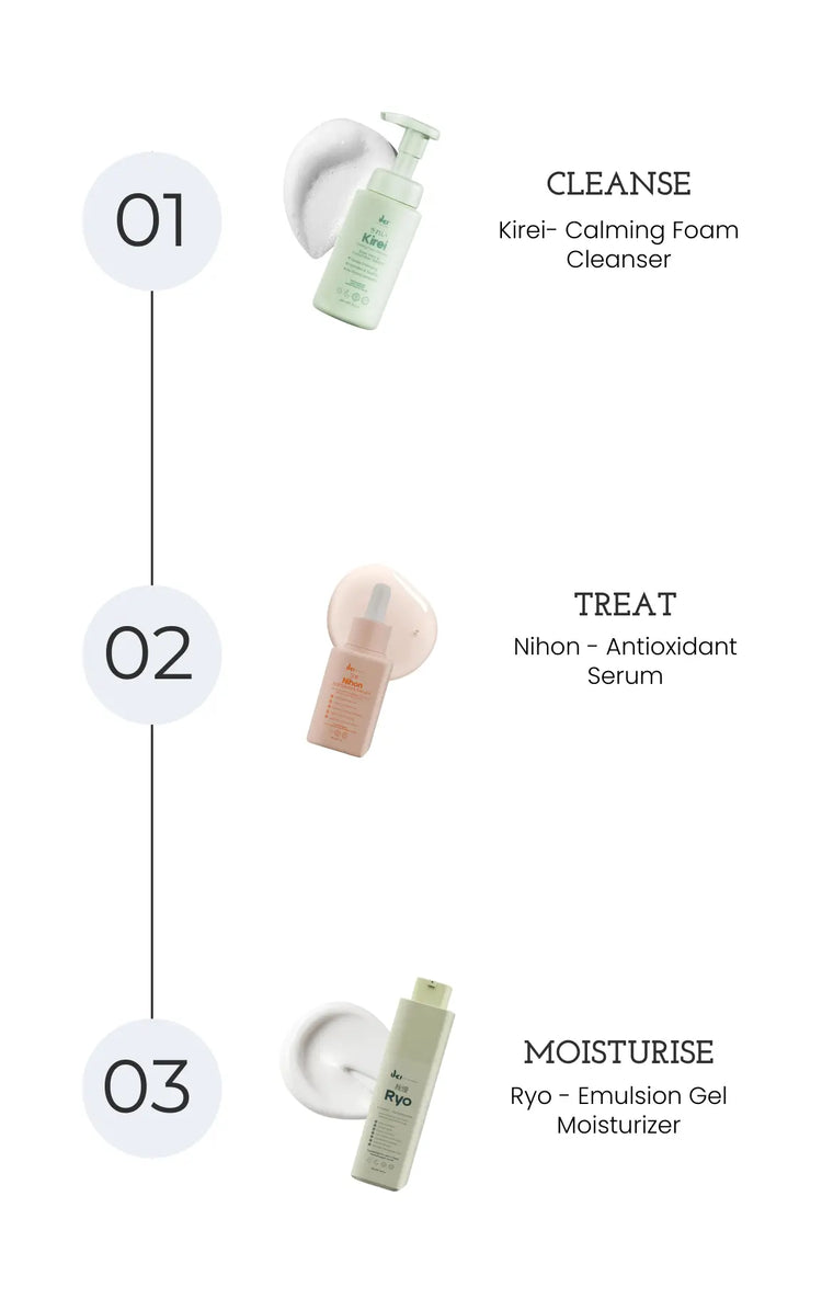 Begin with KIREI to gently cleanse and refresh the skin without disrupting its natural barrier. Follow with NIHON Antioxidant Serum to help protect against daily environmental stressors and support a healthy glow. Finish with RYO Emulsion Gel Moisturizer to deliver lightweight hydration and maintain balance throughout the day.