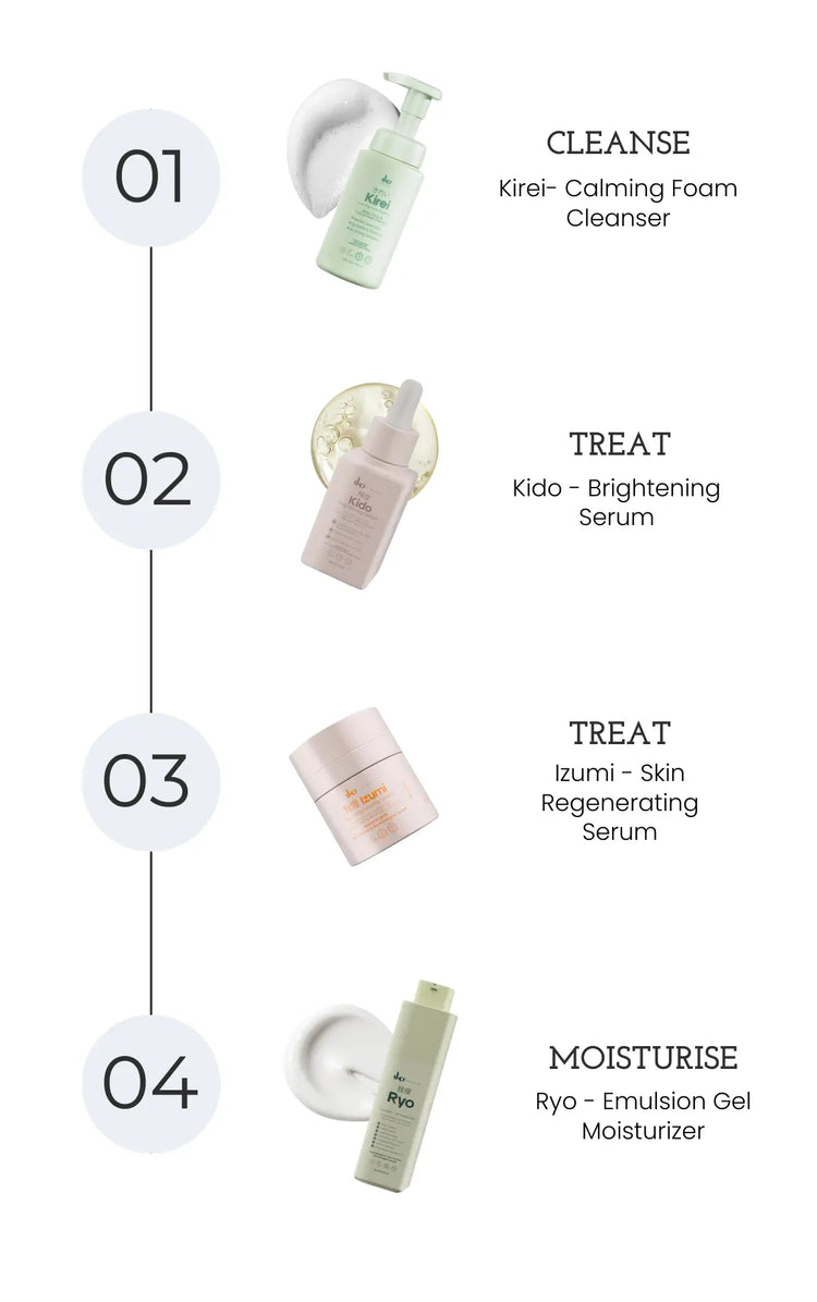In the morning, KIREI cleanses and calms, NIHON delivers antioxidant protection and helps maintain an even glow, and RYO provides lightweight hydration for all-day comfort. In the evening, KIREI prepares the skin, KIDO works to brighten and refine tone overnight, and RYO restores moisture and supports skin recovery.